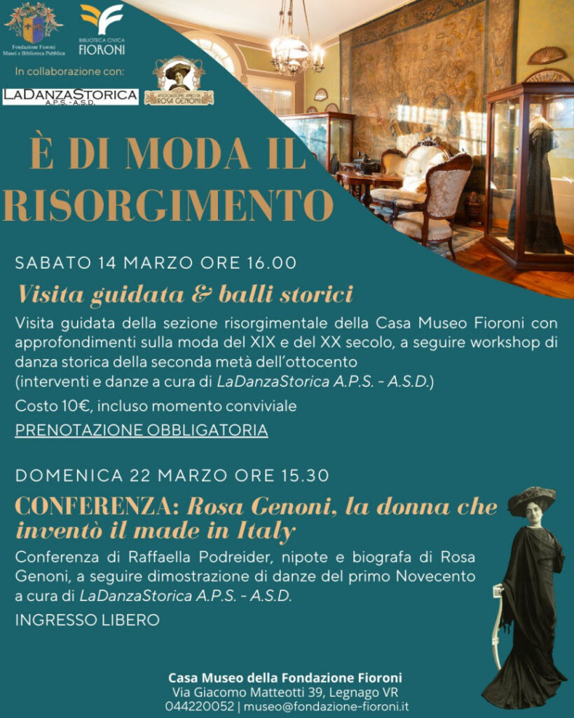 Domenica 22 marzo, alle ore 15.30, presso la Casa Museo della Fondazione, si terrà la conferenza di Raffaella Podreider dal titolo “Rosa Genoni, la donna che inventò il Made in Italy”. Un’occasione unica per conoscere un aspetto davvero significativo della storia dell’Ottocento italiano ed europeo. A seguire dimostrazione di balli storici a cura della Associazione LaDanzaStorica.